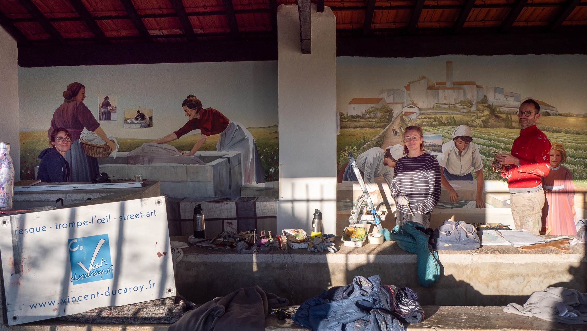 Je suis heureux de partager avec vous les images de la fresque du souvenir des lavandières, actuellement en cours de réalisation au lavoir de Plascassier. Cette œuvre mettra à