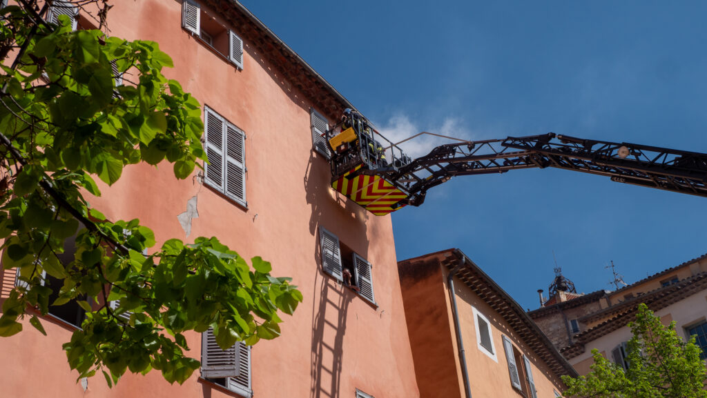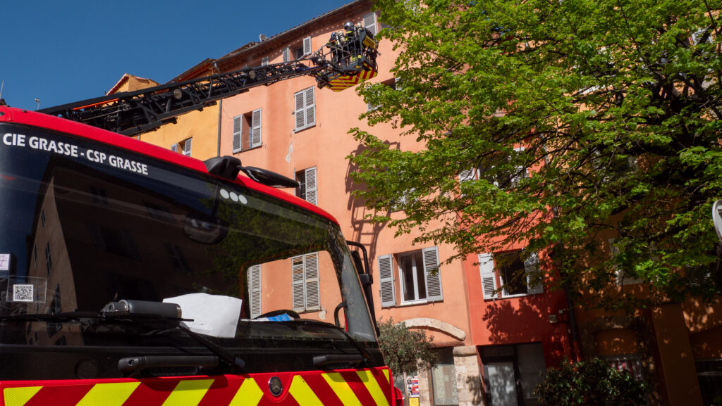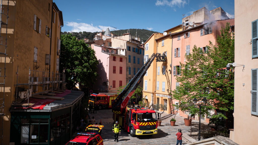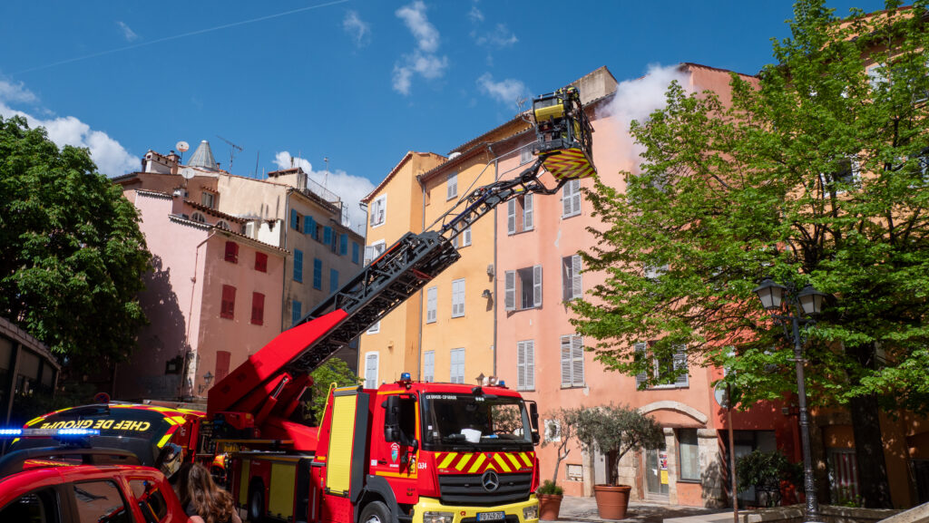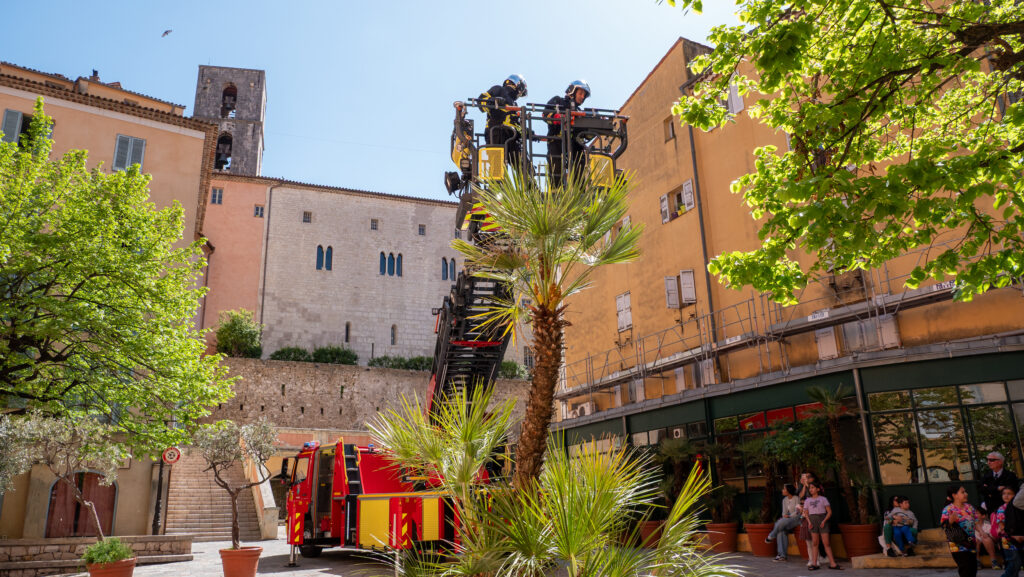 À l’occasion de l’exercice organisé par les Sapeurs-pompiers 06 – SDIS 06, une simulation d’incendie d’immeuble a été menée en centre-ville, place aux Herbes et place de l’Évêché.