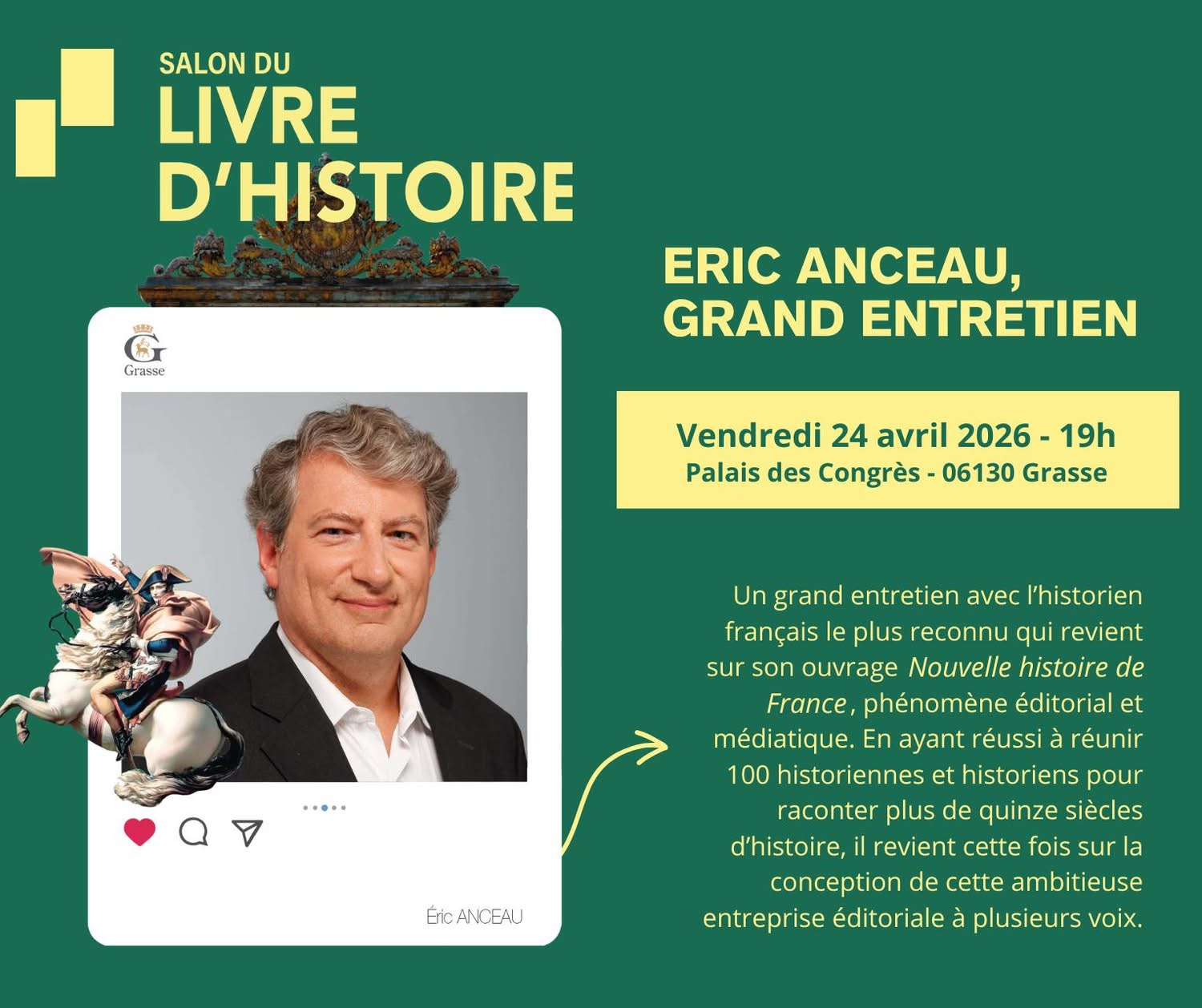 📍 Dès 19h00, toujours au Palais des Congrès, le Grand Entretien avec Éric ANCEAU donnera le ton. À travers une réflexion passionnante sur la manière d’écrire l’histoire de France aujourd’hui, il nous invite à repenser notre récit national dans toute sa richesse et sa pluralité.