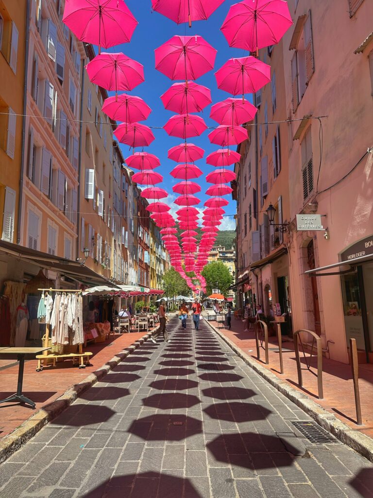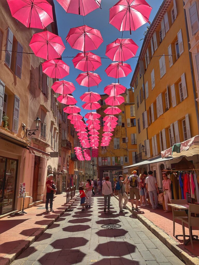 Aujourd’hui, la place aux Aires s’illumine sous un magnifique soleil, sublimée par ses emblématiques parapluies roses qui offrent un spectacle aussi poétique qu’élégant.