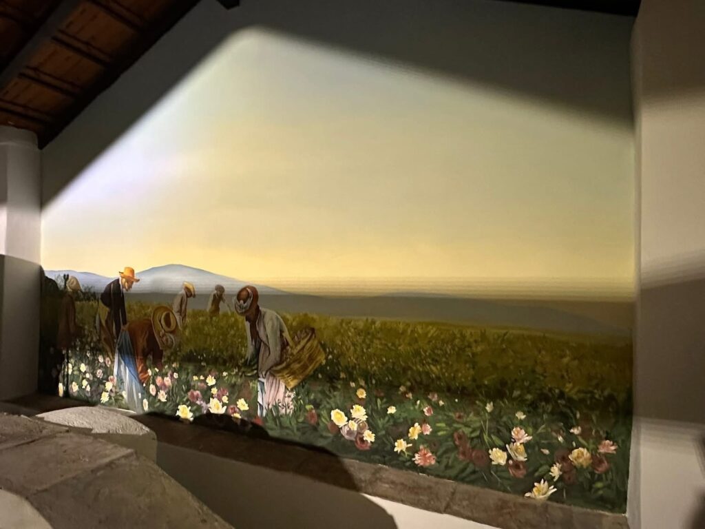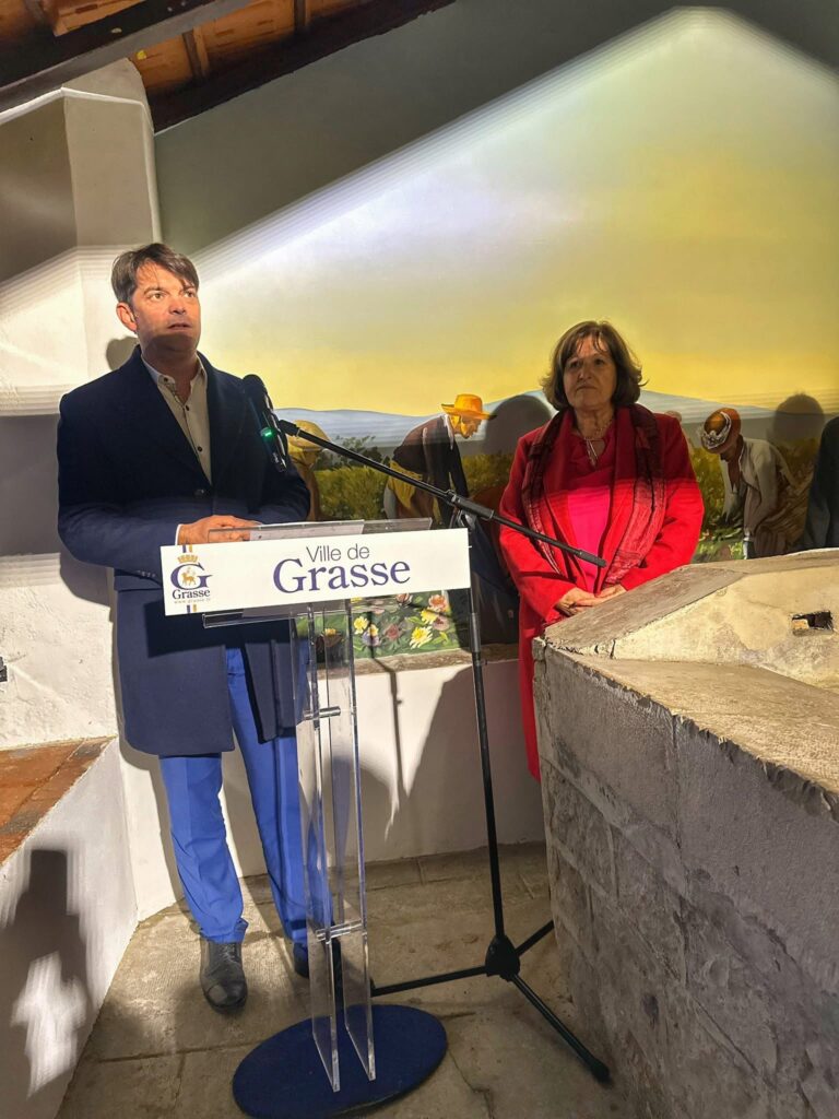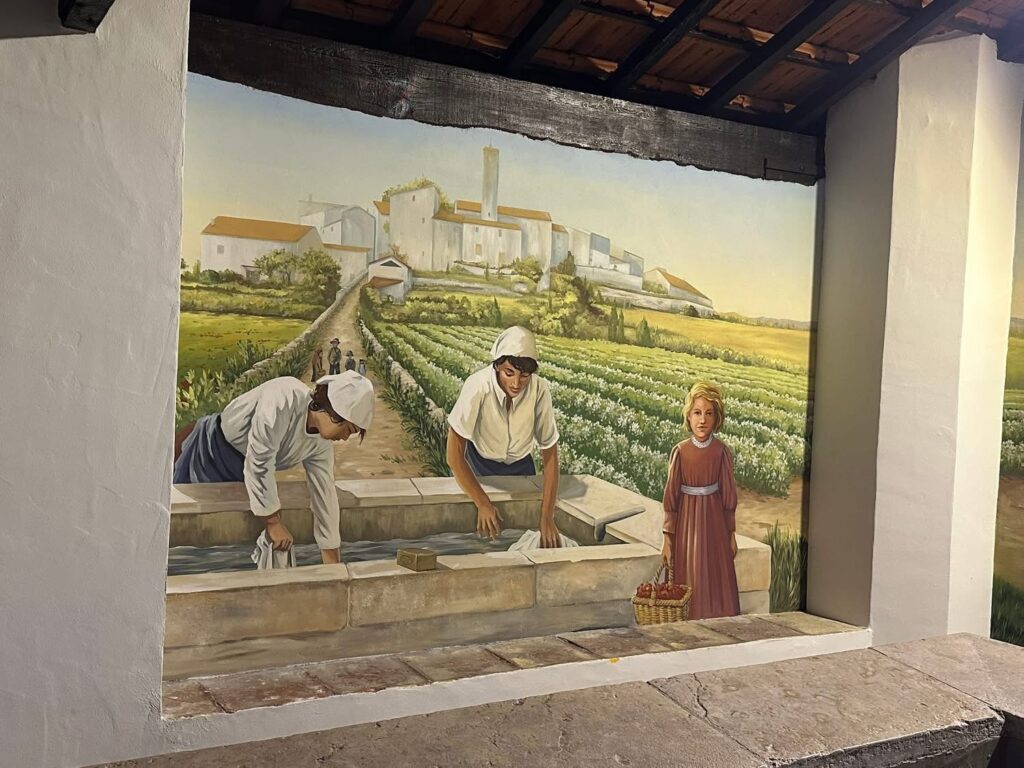 Réalisée au lavoir de Plascassier, cette fresque du souvenir fait revivre les scènes de vie du hameau et nos savoir-faire liés au parfum, notamment la culture des plantes à parfum, éléments forts de l’identité de notre territoire.